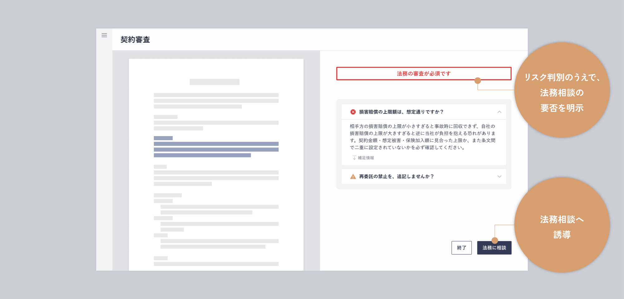 高リスク案件の場合は、「法務審査が必要」と明示し、法務への相談へ誘導。